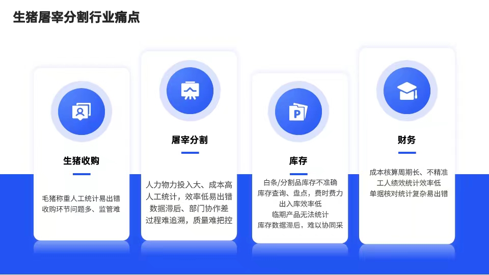 通過云存儲、物聯(lián)網(wǎng)、工業(yè)互聯(lián)網(wǎng)等技術(shù),對生豬采購、屠宰分割、倉儲配送所有環(huán)節(jié)進(jìn)行信息化升級,實現(xiàn)采購結(jié)算透明化、屠宰分割最優(yōu)化、生產(chǎn)排產(chǎn)智能化、車間管理數(shù)字化、倉儲管理可視化、業(yè)務(wù)財務(wù)一體化等管理目標(biāo)。