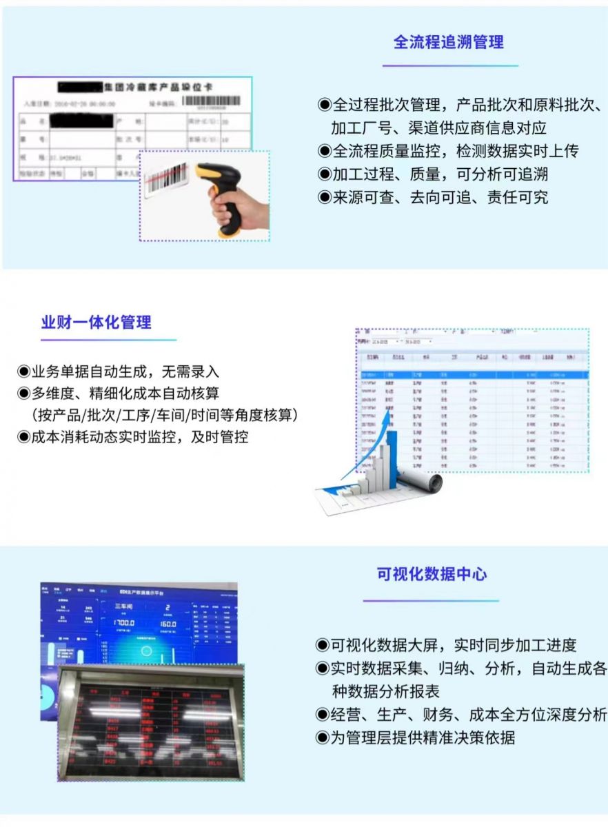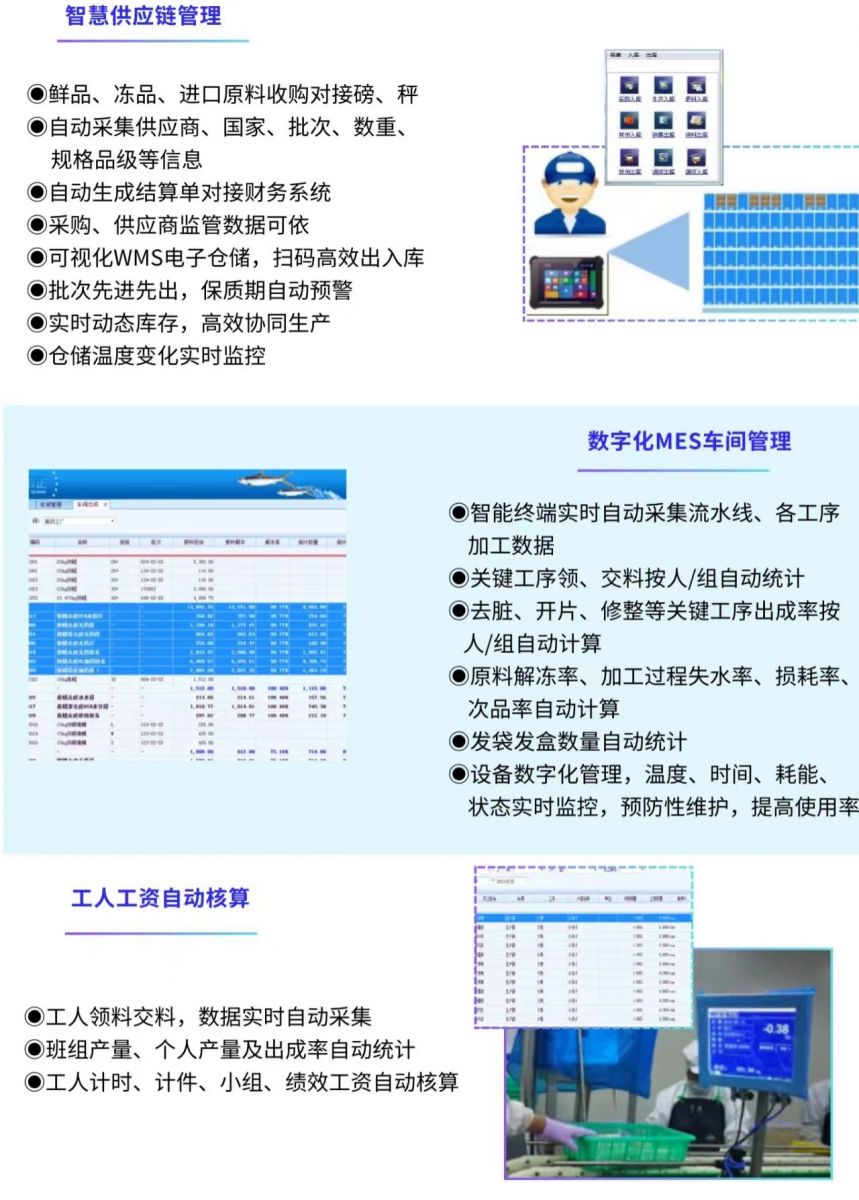 針對魚、蝦、貝、蟹等水產(chǎn)品的不同加工特性,采用信息化手段對其全業(yè)務(wù)鏈進(jìn)行數(shù)字一體化全面管控,包括采購-前處理-調(diào)理/熟制加工-冷凍-包裝-入庫-銷售發(fā)貨等所有環(huán)節(jié),幫助水產(chǎn)加工企業(yè)實(shí)時掌握生產(chǎn)數(shù)據(jù)、即時庫存,優(yōu)化產(chǎn)線作業(yè)、提高生產(chǎn)和管理效率,有助降低成本、提高生產(chǎn)效率,實(shí)現(xiàn)全流程質(zhì)量安全追溯。