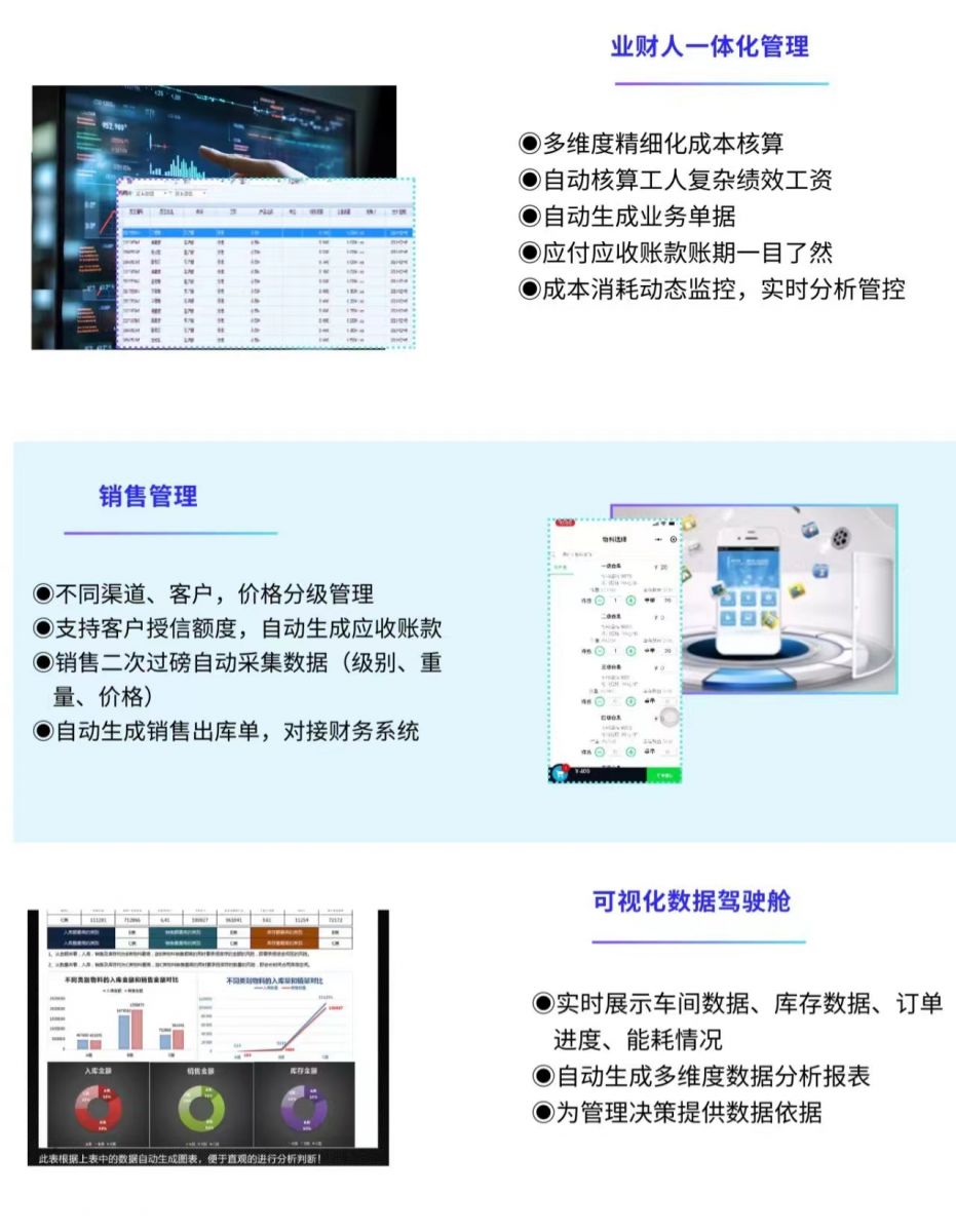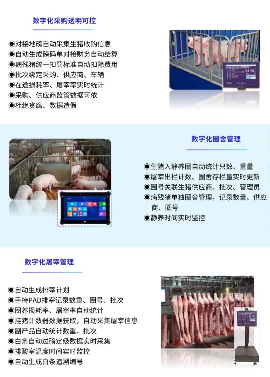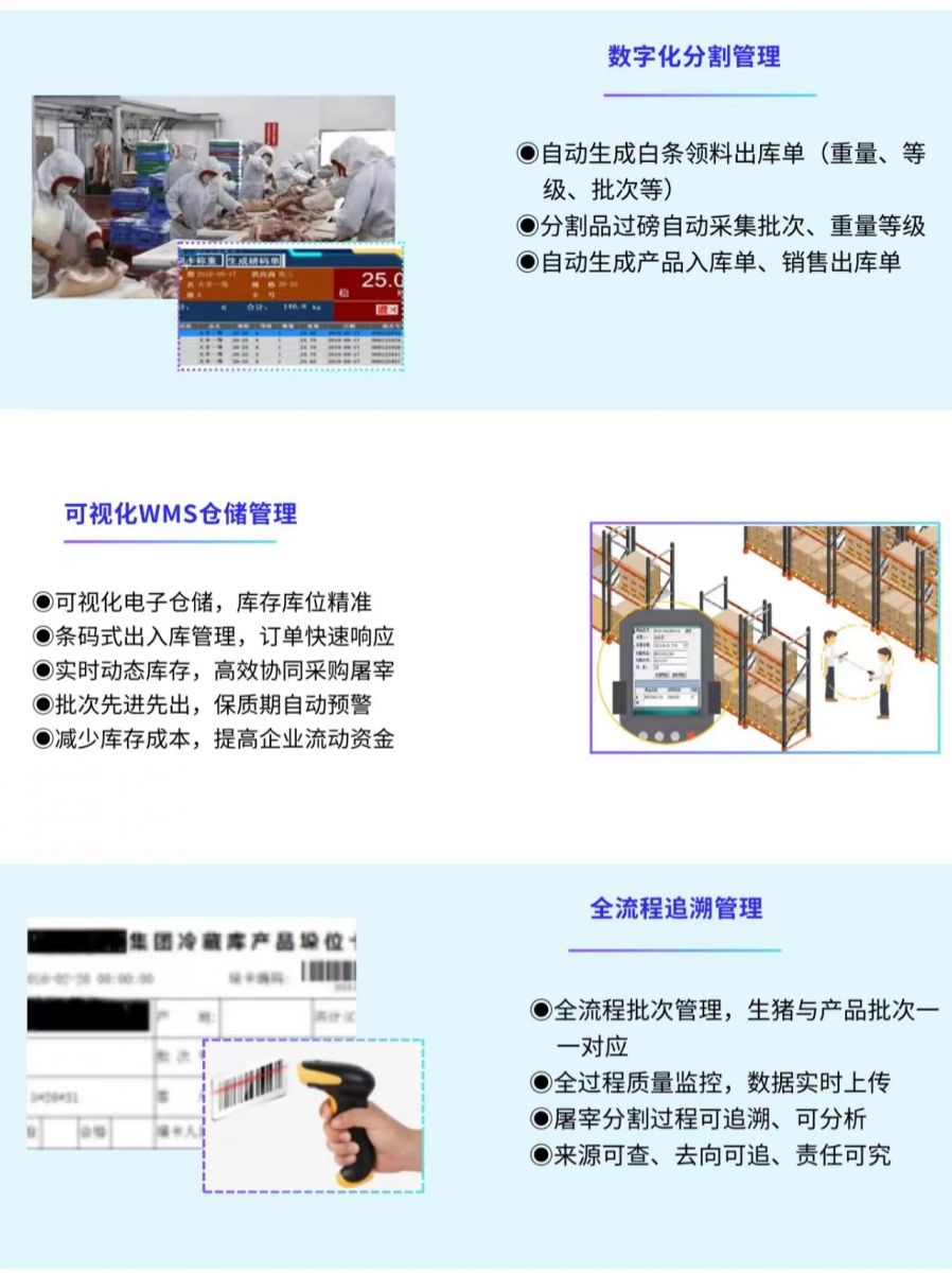通過云存儲、物聯(lián)網(wǎng)、工業(yè)互聯(lián)網(wǎng)等技術(shù),對生豬采購、屠宰分割、倉儲配送所有環(huán)節(jié)進(jìn)行信息化升級,實現(xiàn)采購結(jié)算透明化、屠宰分割最優(yōu)化、生產(chǎn)排產(chǎn)智能化、車間管理數(shù)字化、倉儲管理可視化、業(yè)務(wù)財務(wù)一體化等管理目標(biāo)。